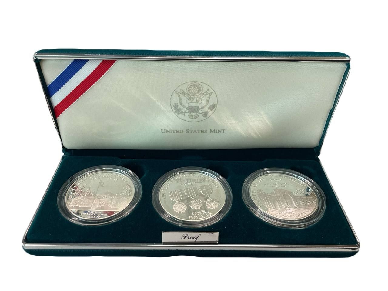 США официальный набор из 3 монет (1 доллар) 1994 Мемориал ветеранов Вьетнама, Национальный музей военнопленных и Мемориал женщинам на военной службе KM 250, 251 и 252 серебро PROOF 2-4-2-02