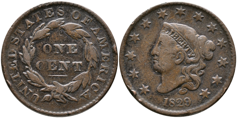 США 1 ЦЕНТ 1829 ЛИБЕРТИ, ДИАМЕТР 28,5 ММ., РОБЕРТ СКОТ медь 32-132