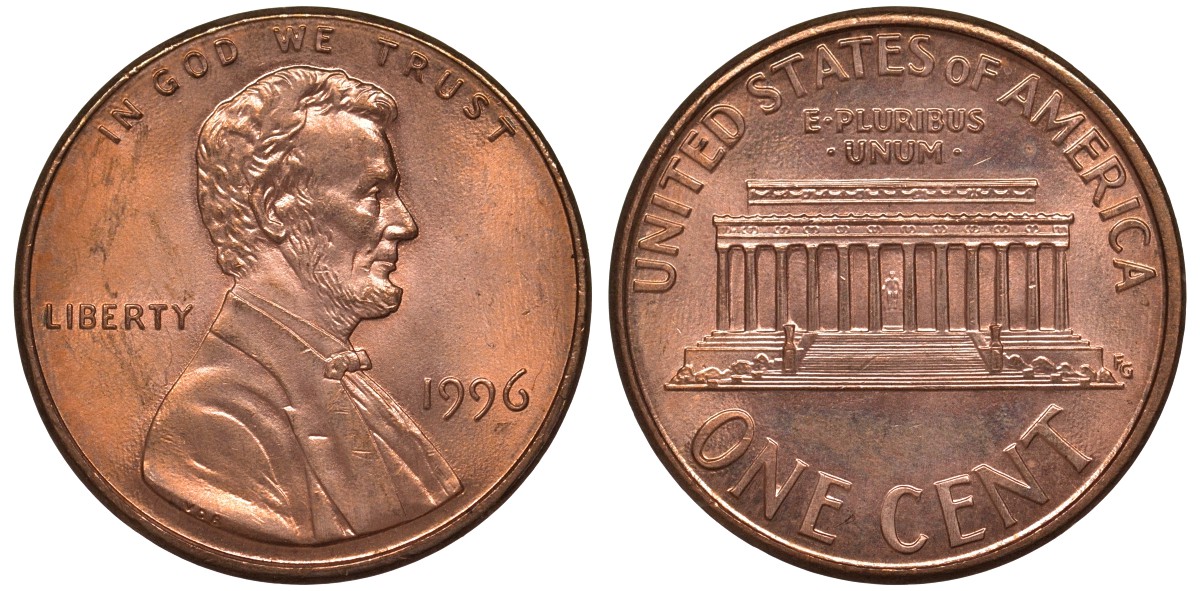 США 1 цент 1996 Линкольн KM 201b медь цинк 4128-612
