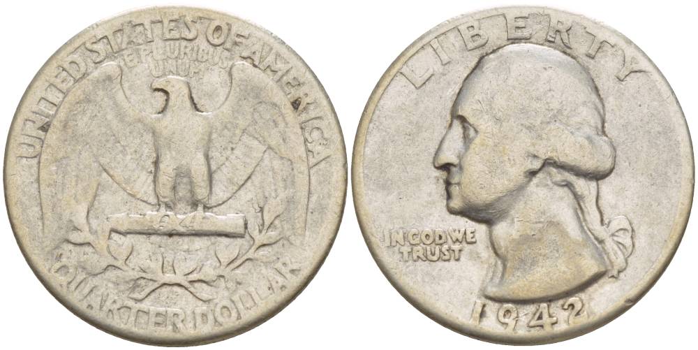 США 25 центов = квотер 1942 Вашингтон KM 164 серебро 4544-624