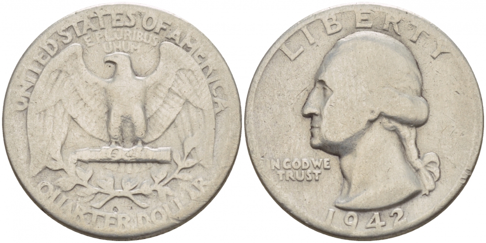 США 25 центов = квотер 1942 Вашингтон KM 164 серебро 4546-1242