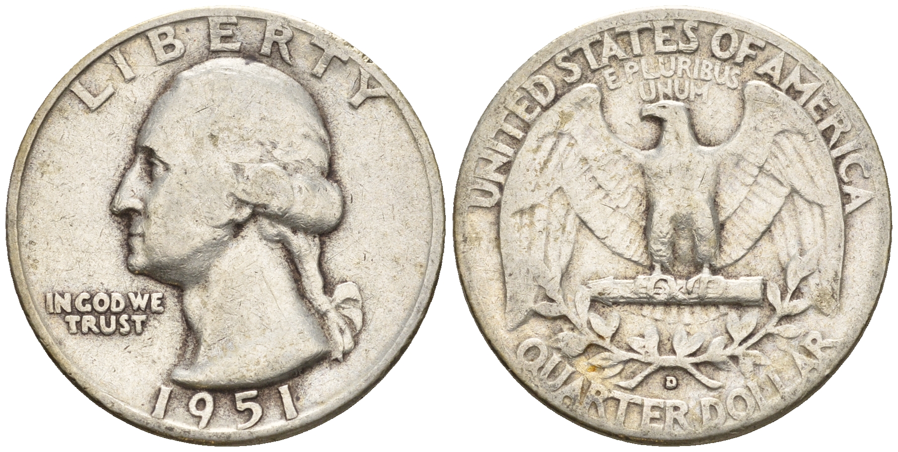 США 25 центов = квотер 1951 D, Вашингтон KM 164 серебро 85-1142