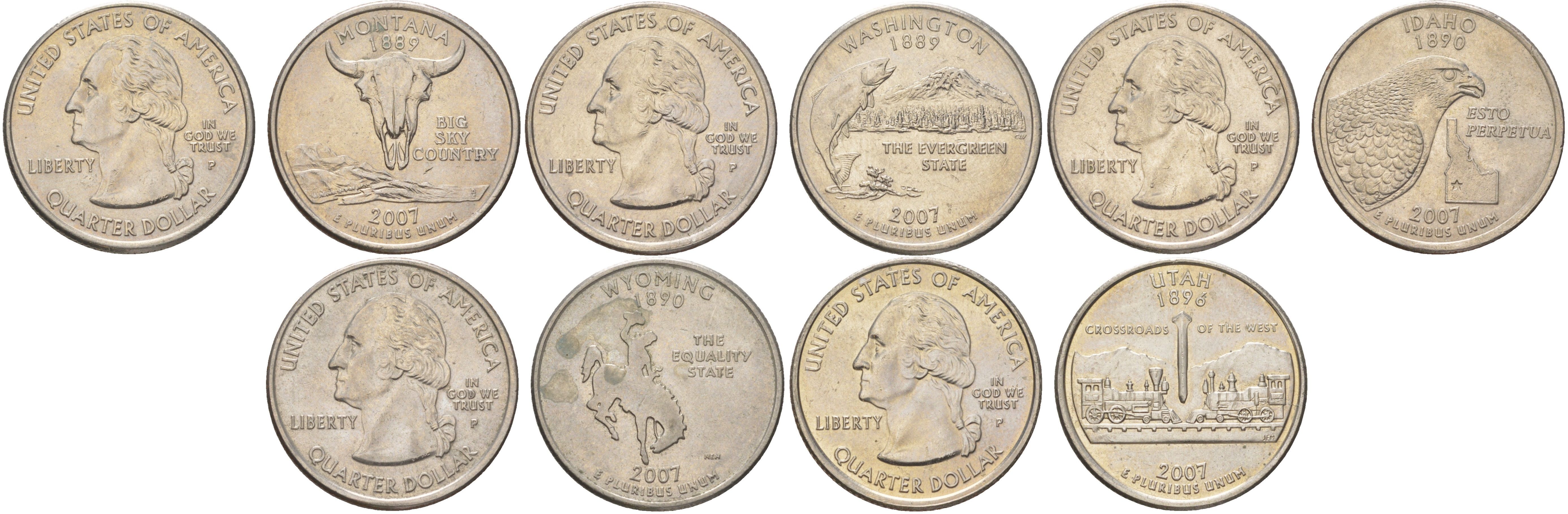 США годовой набор из 5 монет (25 центов, квотер, 1/4 доллара) серии квотеры 50 штатов 2007 Квотер штата Монтана, Вашингтон, Айдахо, Вайоминг и Юта KM 396, 397, 398, 399 и 400 медь плакированный медно-никелем UNC 4629-141-145