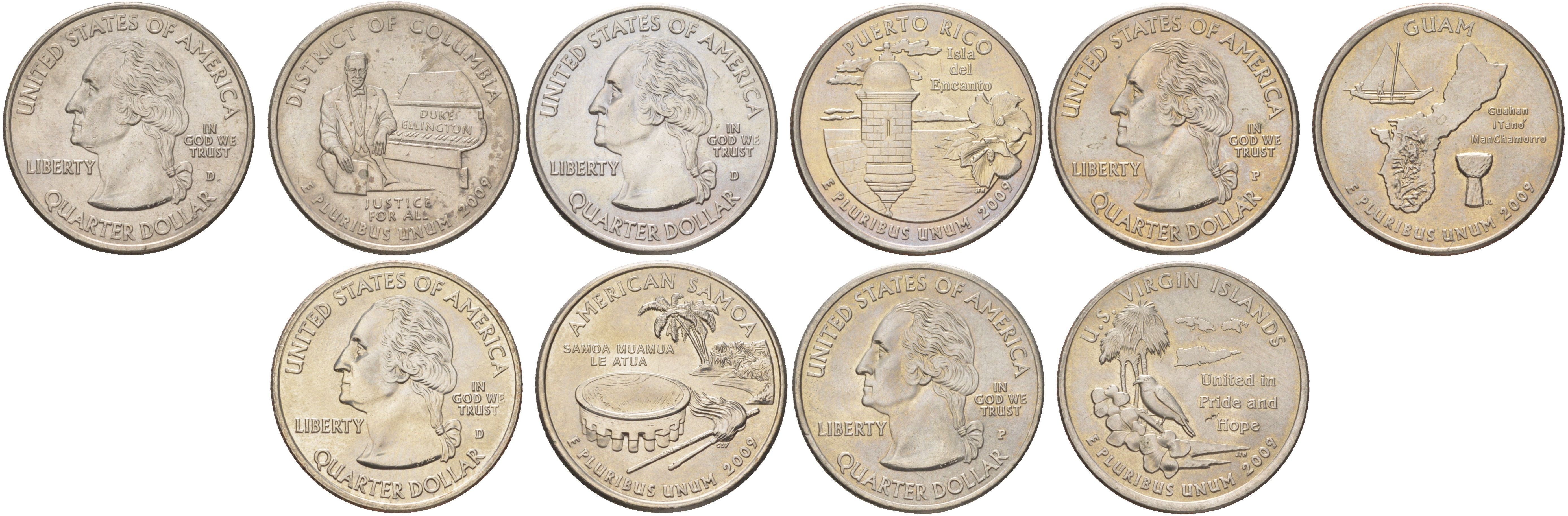 США годовой набор из 5 монет (25 центов, квотер, 1/4 доллара) серии квотеры 50 штатов 2009 Квотер штата Округа Колумбия, Пуэрто-Рико, Гуам, Американского Самоа и Американских Виргинских островов KM 445, 446, 447 и 448, 449 медь плакированный медно-никелем