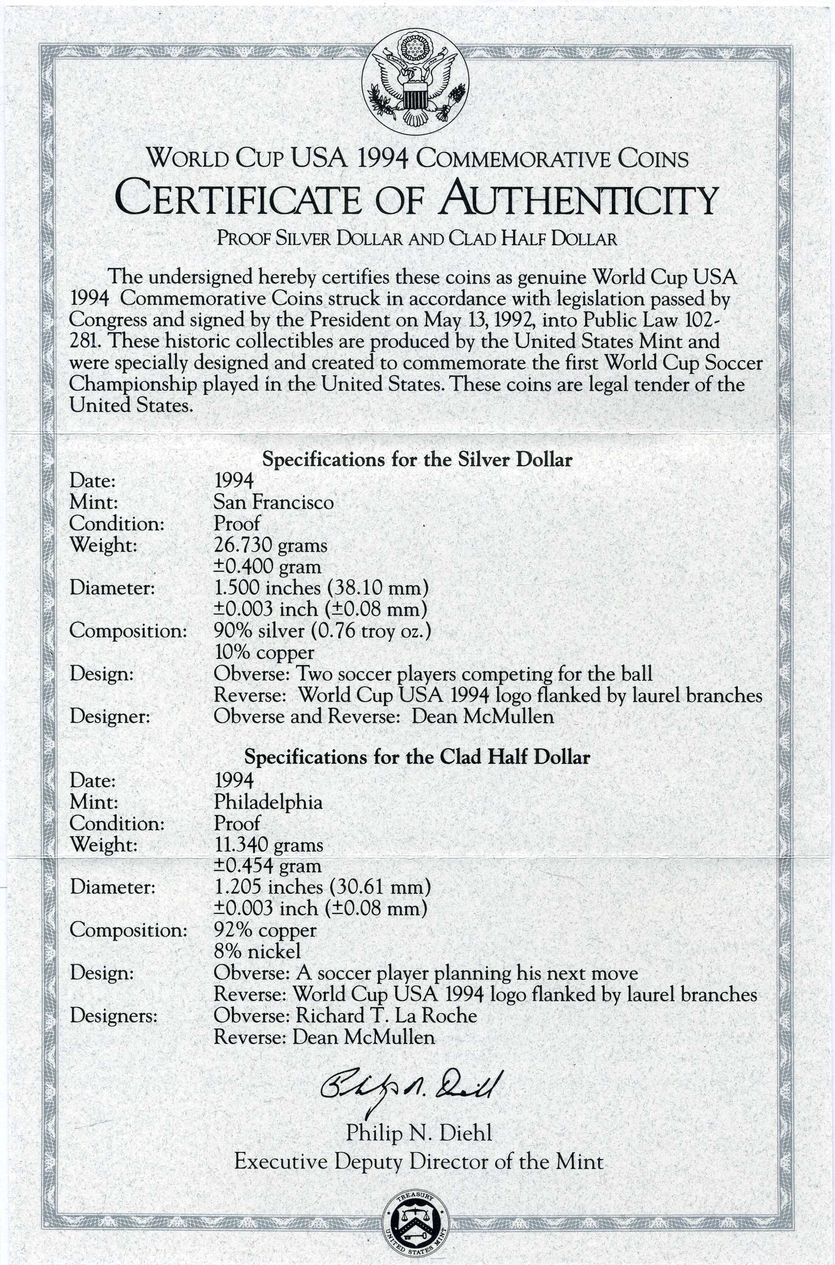 США набор из 2 монет 1994 S, чемпионат мира по футболу в США, 1 доллар и 50 центов, в оригинальной коробке, сертификат KM 246, 247 серебро, медь плакированная медно-никелем PROOF 00-00