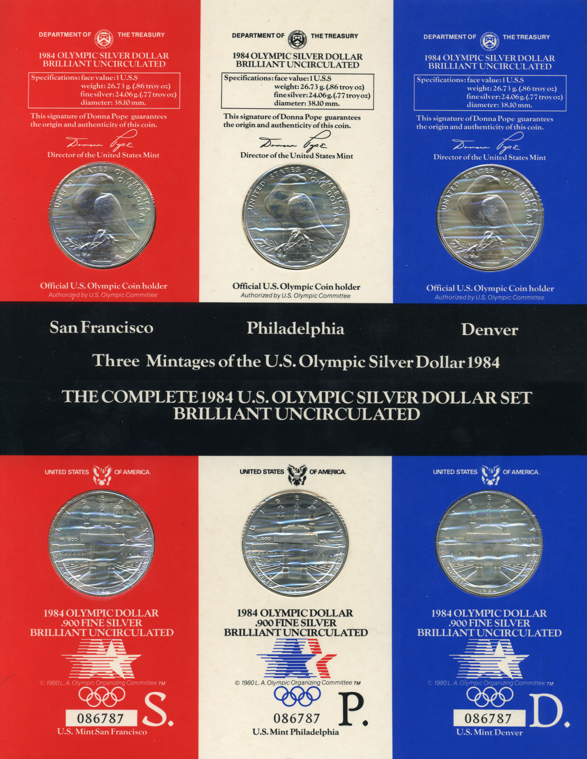 США набор из 3 монет по 1 доллару 1984 S, P, D, Олимпийские игры в Лос-Анджелесе, стадион, в оригинальном буклете KM 210 серебро UNC 7-4-2-28