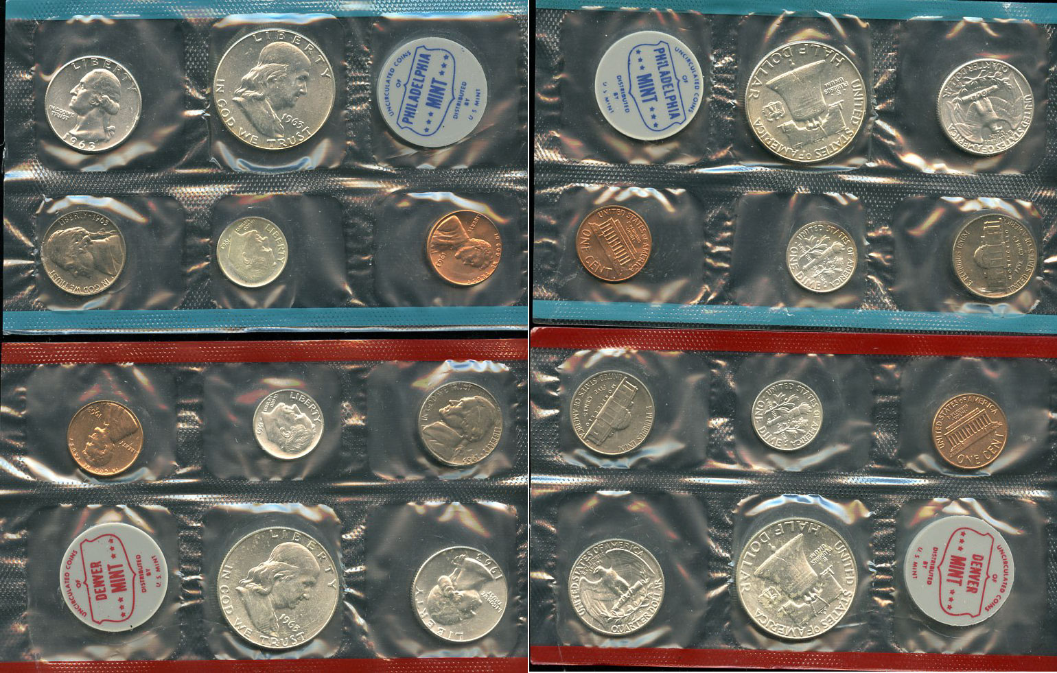 США официальные наборы из 10 монет и 2 жетона монетного двора 1963 D, P, Франклин KM MS 116 серебро UNC 3-6-1-11