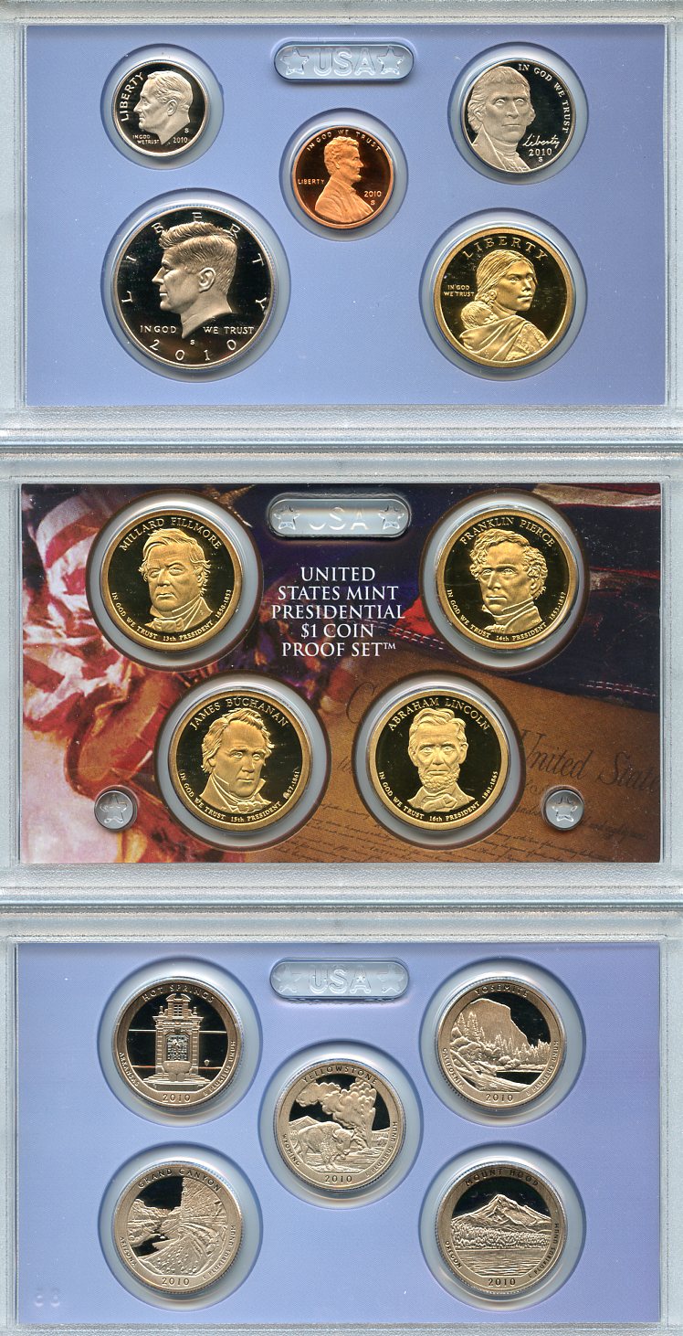 США официальный набор из 14 монет, в 3 пластиковых сетах 2010 годовой набор и юбилейные монет (1 доллар и 25 центов), в оригинальной коробке, сертификат KM PS 245 PROOF 8-2-03-15