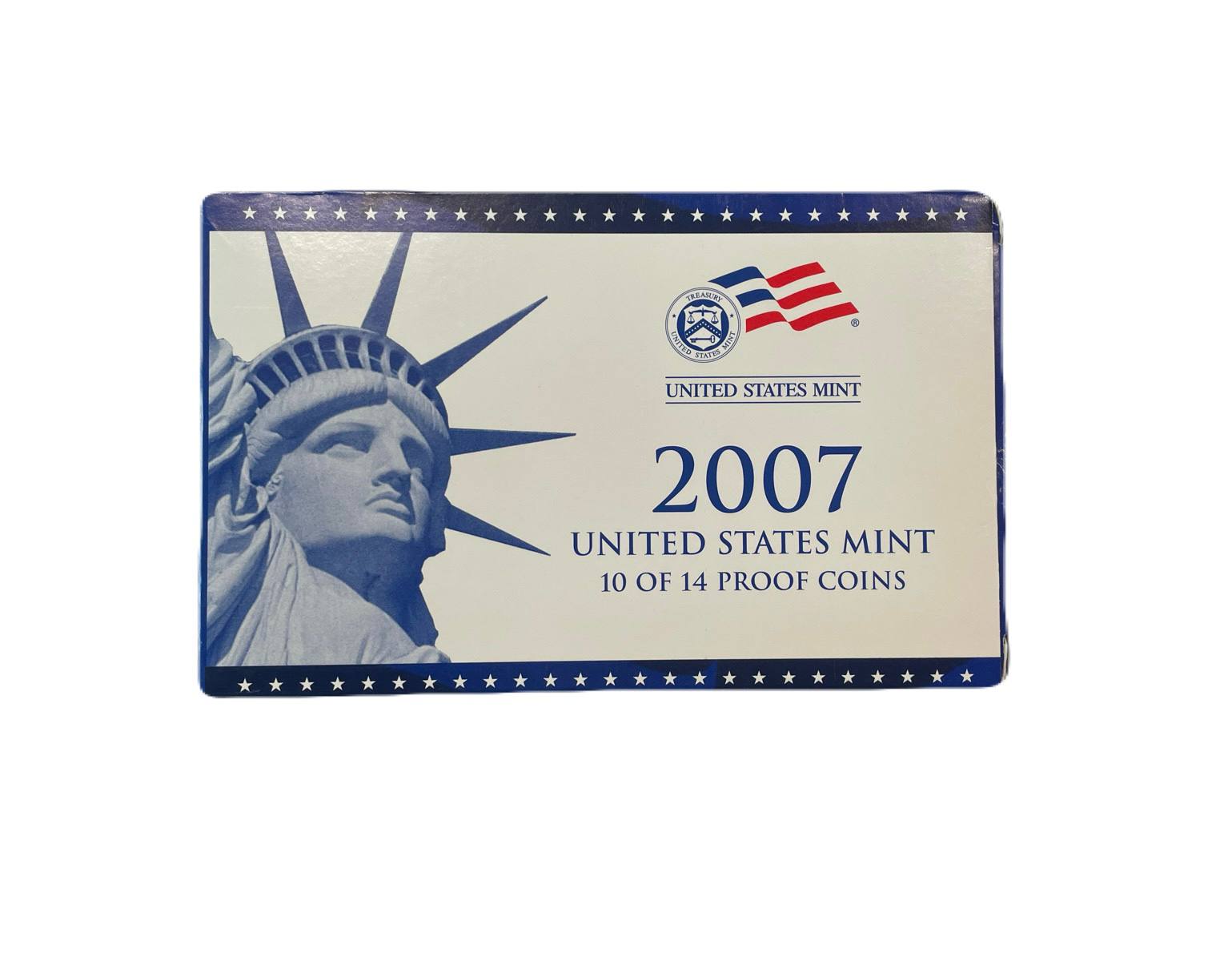 США полный годовой набор из 14 монет (1, 5, 10 (дайм) и 25 (квотер) центов; 1/2 (50 центов) и 1 доллар) 2007 в оригинальной упаковке с сертификатами KM 468, 381, 195a, A202b, 310, 396, 397, 398, 399, 400, 401, 402, 403 и 404 PROOF 8-2-06-74