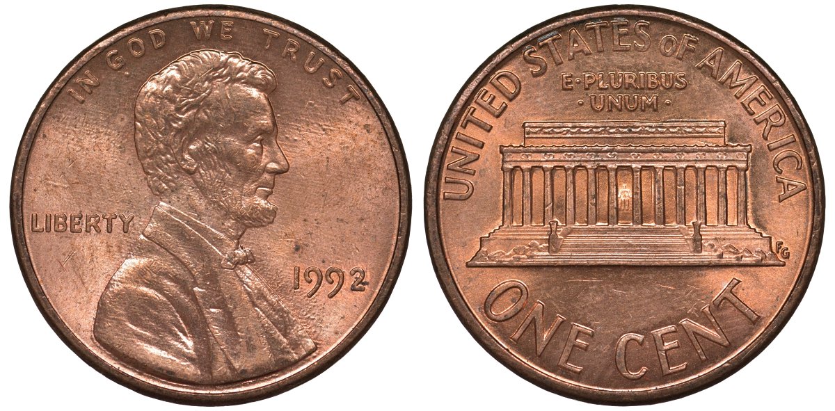 США 1 цент 1992 Линкольн KM 201b цинк плакированный медью 4122-227