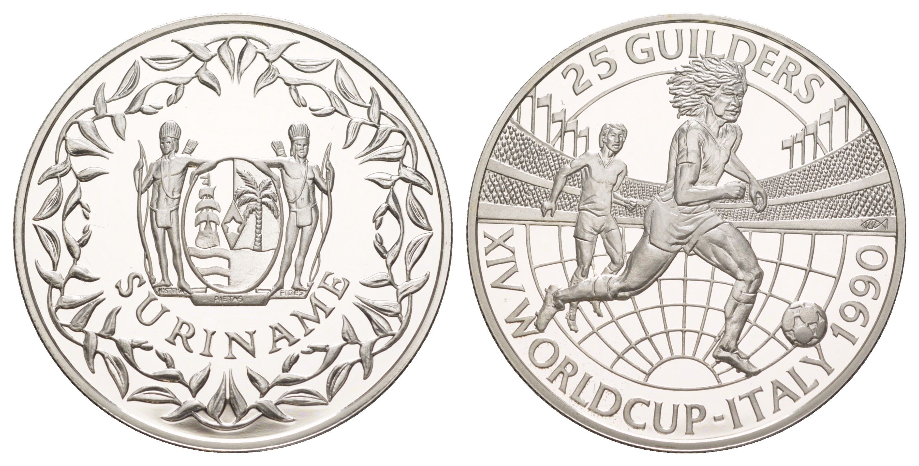 Суринам 25 гульденов 1990 Чемпионат мира по футболу 1990, Италия KM 32 серебро PROOF 1083-2-44