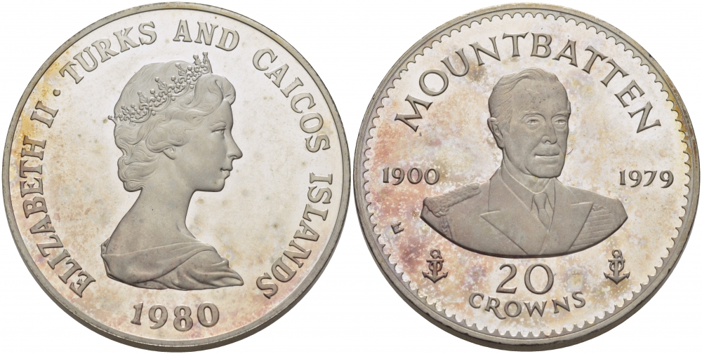 ТЕРКС И КАЙКОС 20 КРОН 1980 ЛУИС МАУНТБАТТЕН, PIEFORTS, 59,86 гр KM P 3 серебро PROOF 01-107-44