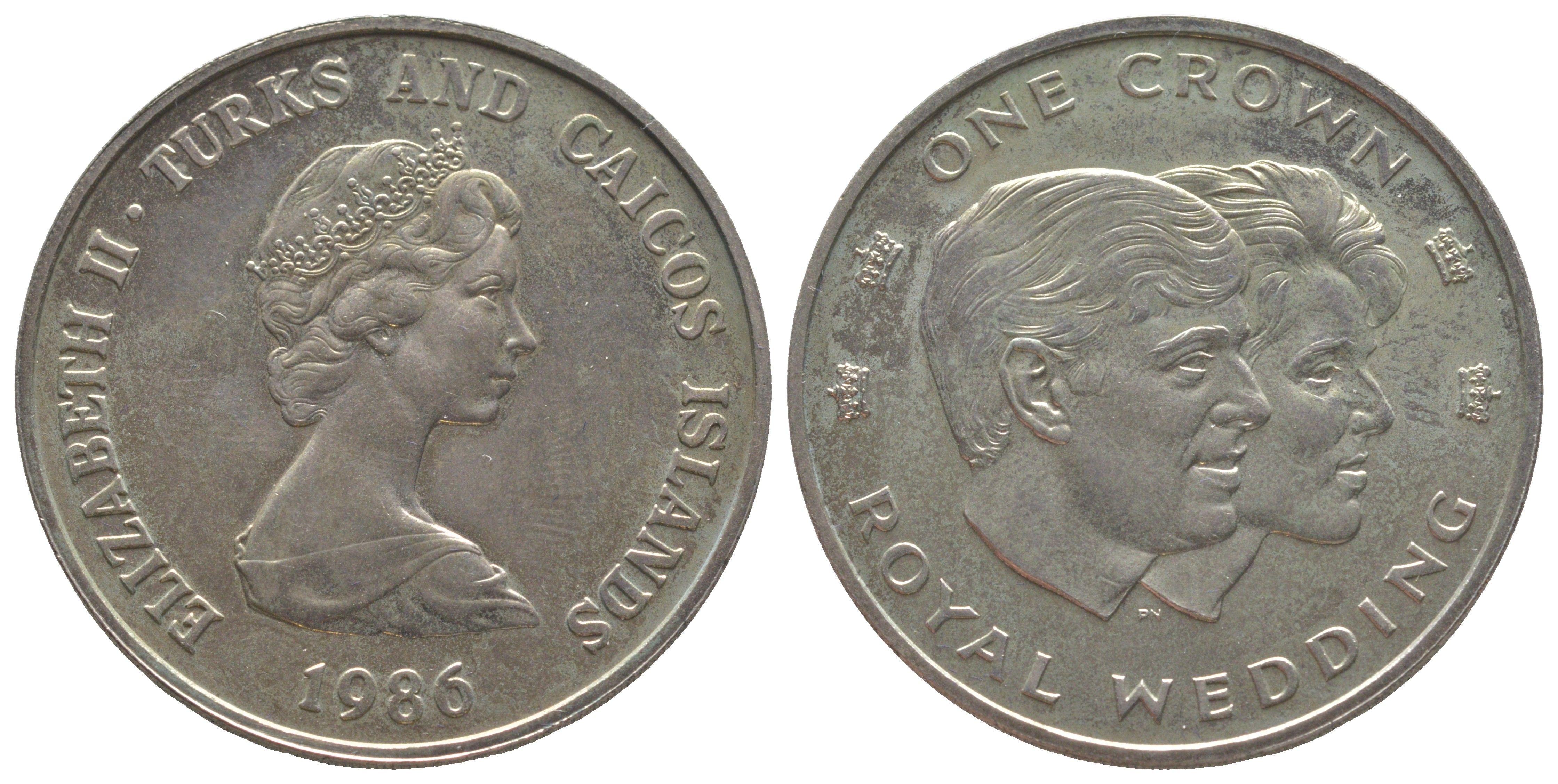 Тёркс и Кайкос 1 крона 1986 Свадьба Принца Эндрю и Сары Маргарет Фергюсон, тираж 20.000 экземпляров KM 60 медно-никель BU 00-1067-7-44