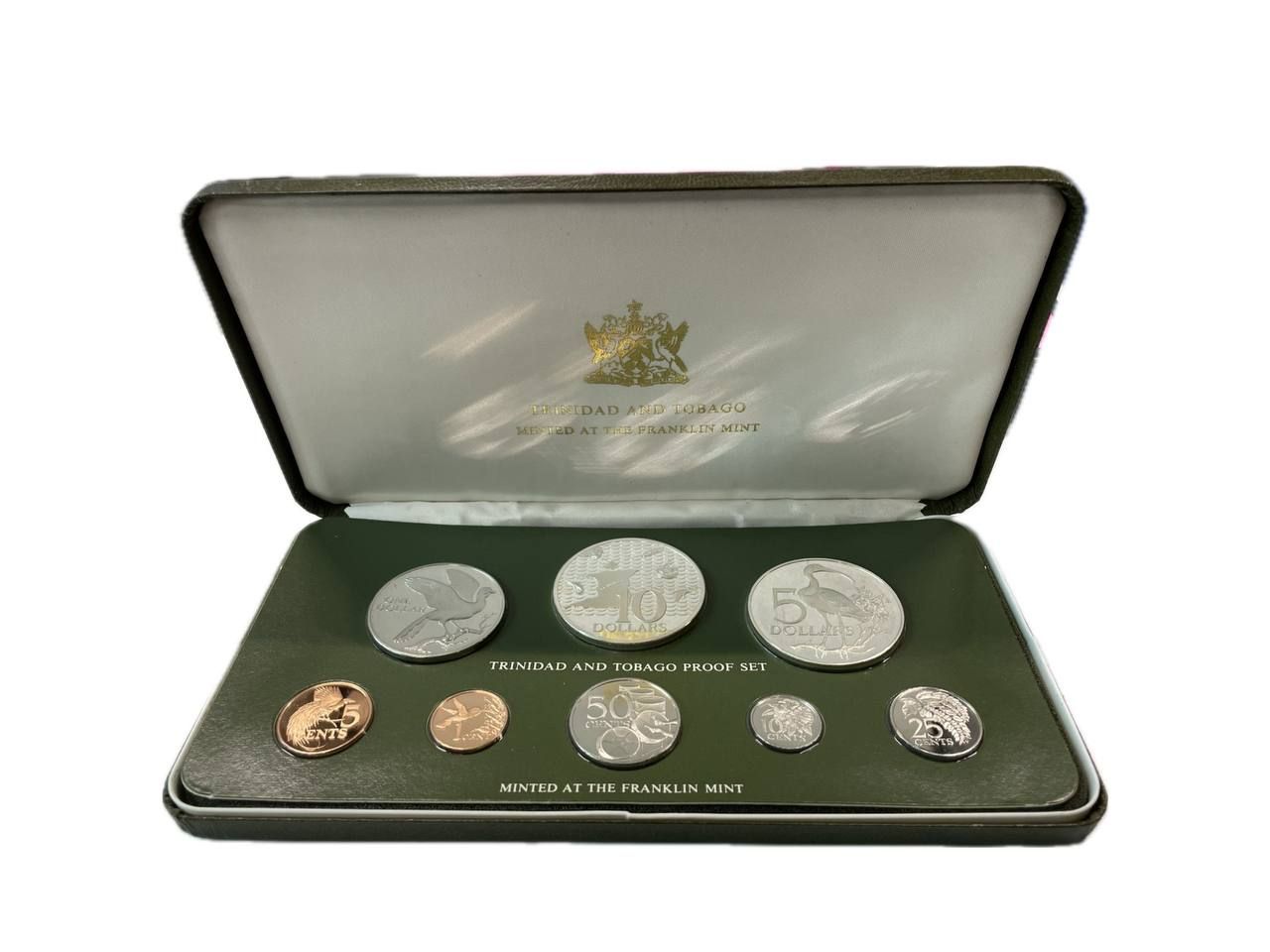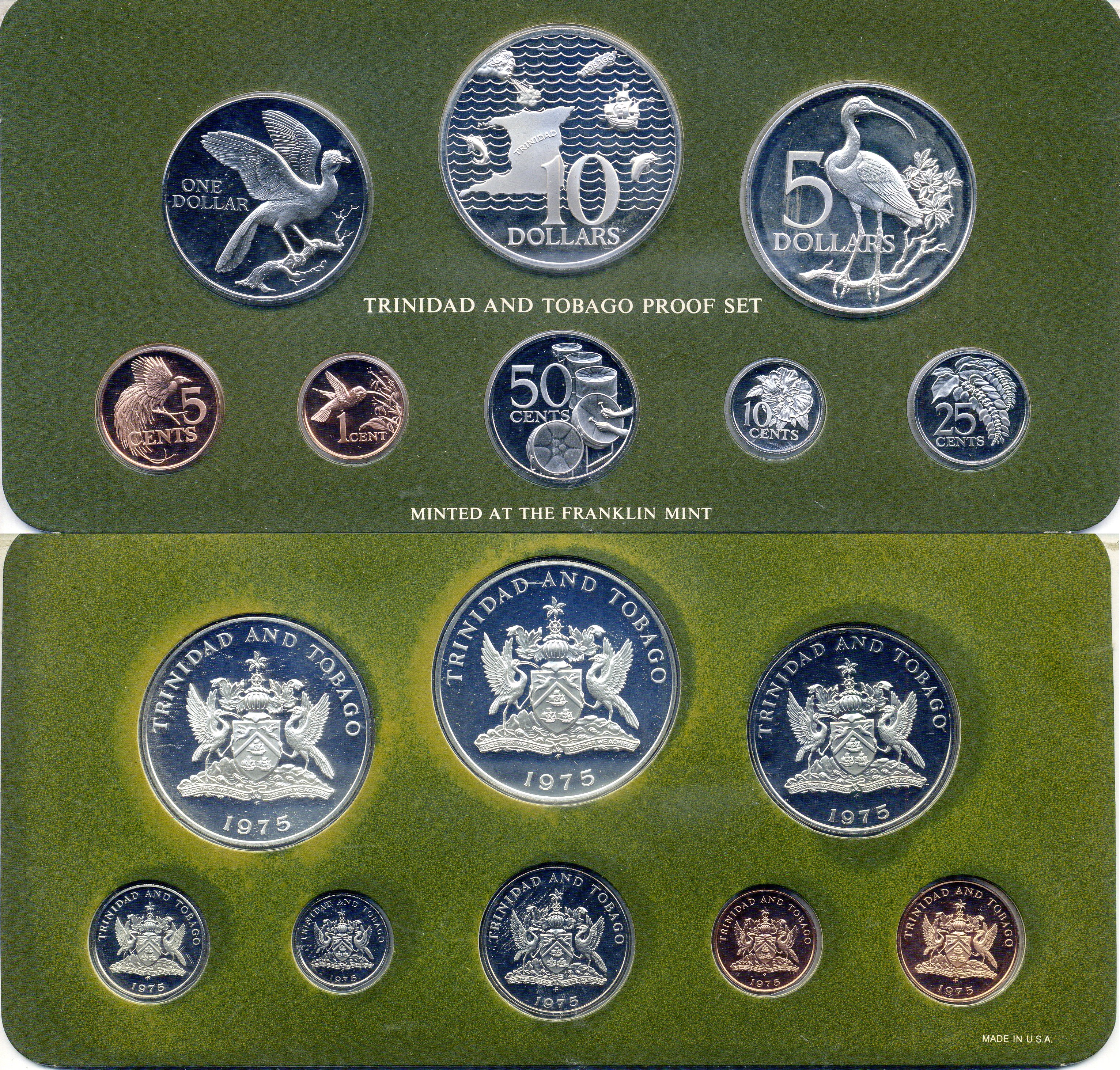 Тринидад и Тобаго набор из 8 монет (1, 5, 10, 25 и 50 центов; 1, 5 и 10 долларов) 1975 в оригинальной упаковке, с сертификатом подлинности KM 25, 26, 27, 28, 22, 23, 8, 24a PROOF 4-3-1-22