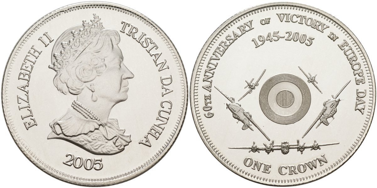 Тристан-да-Кунья 1 крона 2005 60-я годовщина победы в Европе, самолёты серебро PROOF 00-00