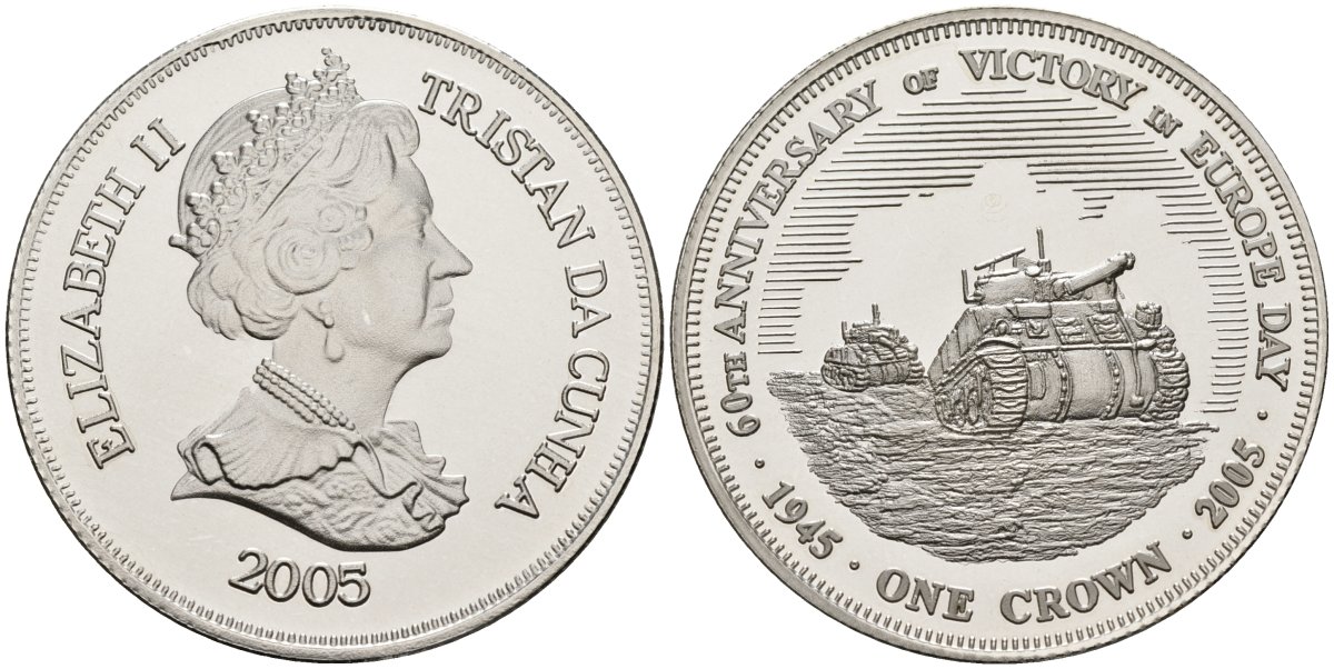 Тристан-да-Кунья 1 крона 2005 60-я годовщина победы в Европе, танки серебро PROOF 00-00