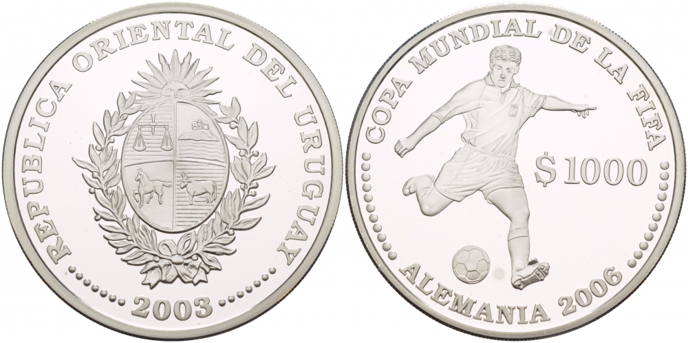 Уругвай 1000 песо 2003 чемпионат мира по футболу 2006 в Германии, удар по мячу КМ 122 серебро PROOF 1088-6-12