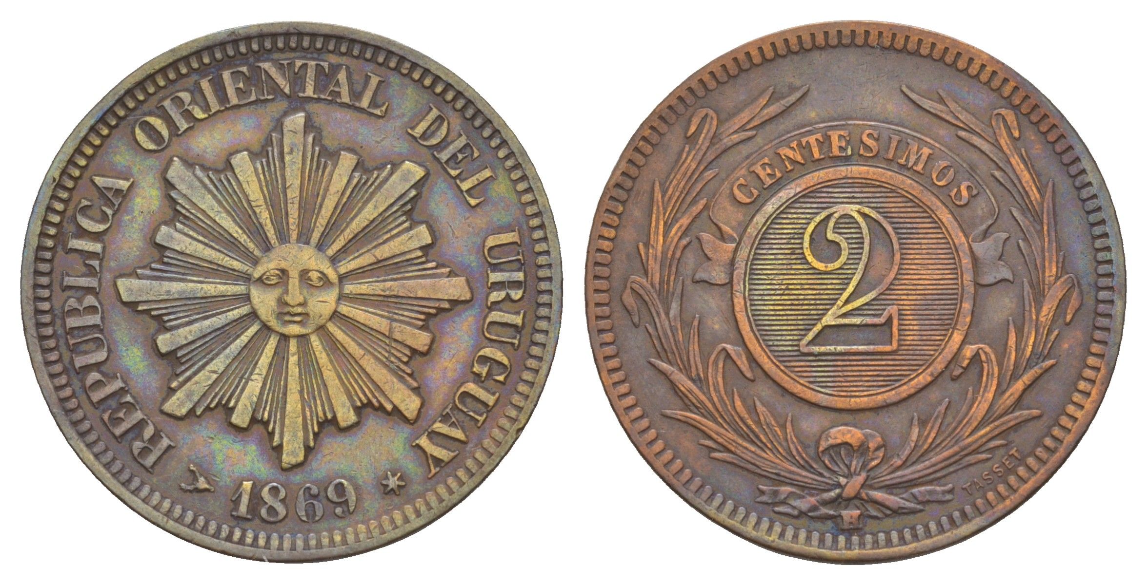 Уругвай 2 сентесимо 1869 год-тип KM 12 бронза 1519-1233
