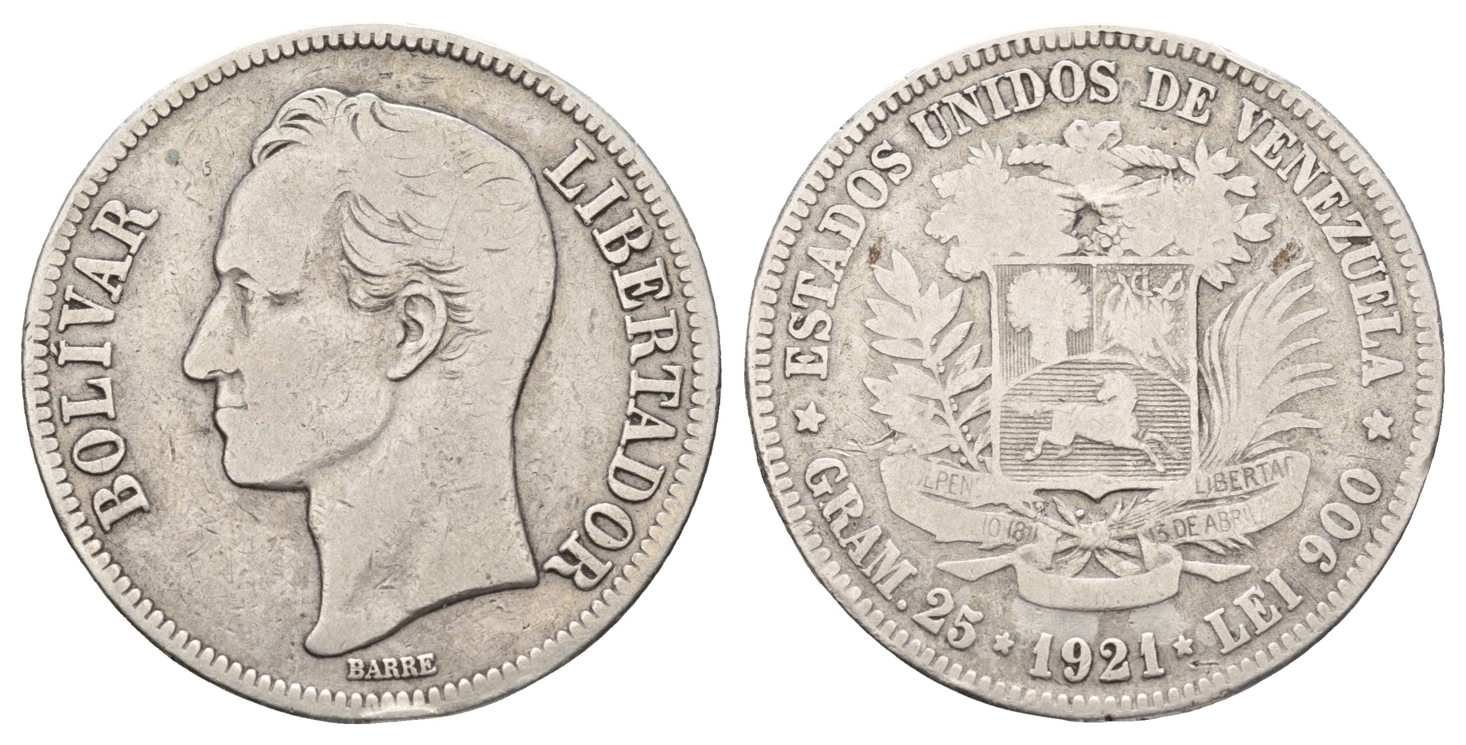Венесуэла 5 боливаров 1921 Y 24.2 серебро 4044-1522