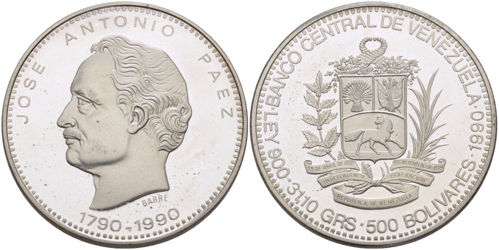 Венесуэла 500 боливаров 1990 200 лет со дня рождения Хосе Антонио Паэс KM 64 серебро PROOF 01-182-41