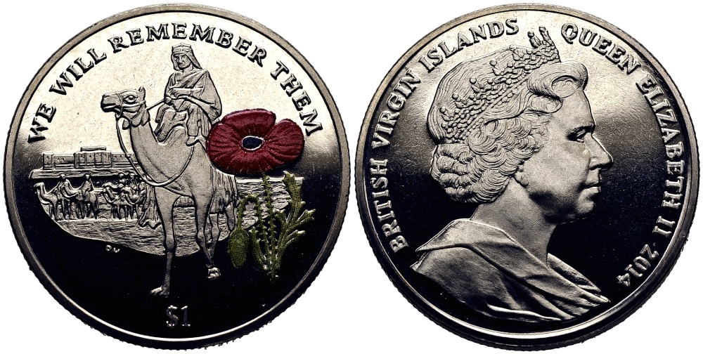 Британские Виргинские острова 1 доллар 2014 в память героев первой мировой войны, солдат верхом на верблюде, красный мак KM NEW медно-никель, эмаль PROOF 1071-4-11
