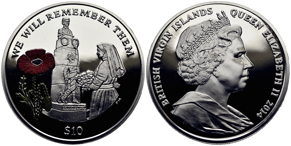 Британские Виргинские острова 10 долларов 2014 в память героев первой мировой войны, памятник, красный мак KM NEW серебро, эмаль PROOF 1071-1-32