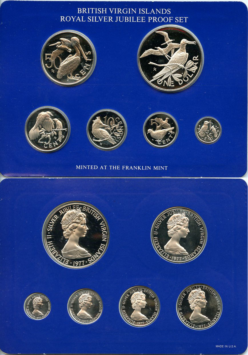 Британские Виргинские острова набор из 6 монет 1977 25 лет правления Елизаветы II (1952-2022), птички, в картонном буклете, запайка, в оригинальной коробке, с сертификатом KM PS 6, KM 9-14 серебро PROOF 8-2-04-13