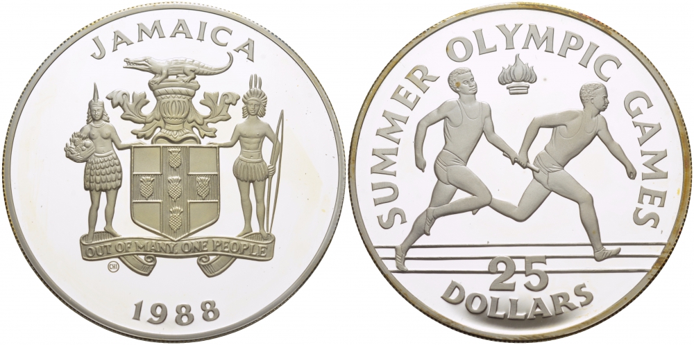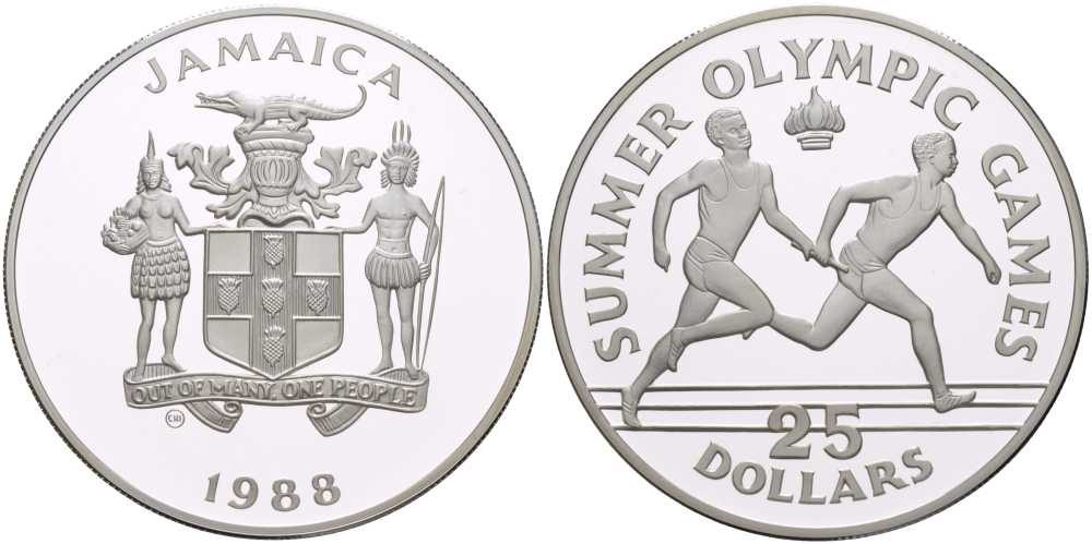 Ямайка 25 долларов 1988 XXIV летние Олимпийские игры 1988 года в Сеуле, эстафета KM 141 серебро PROOF 11-102-23
