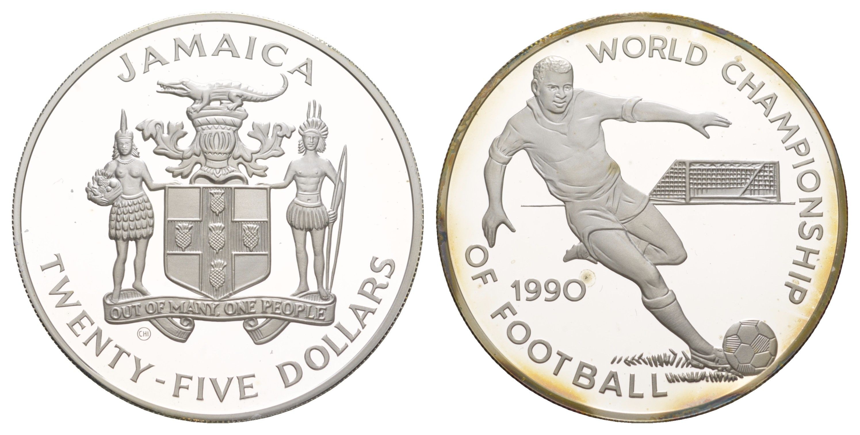 Ямайка 25 долларов 1990 Чемпионат мира по футболу 1990, Италия KM 142 серебро PROOF 1083-2-43