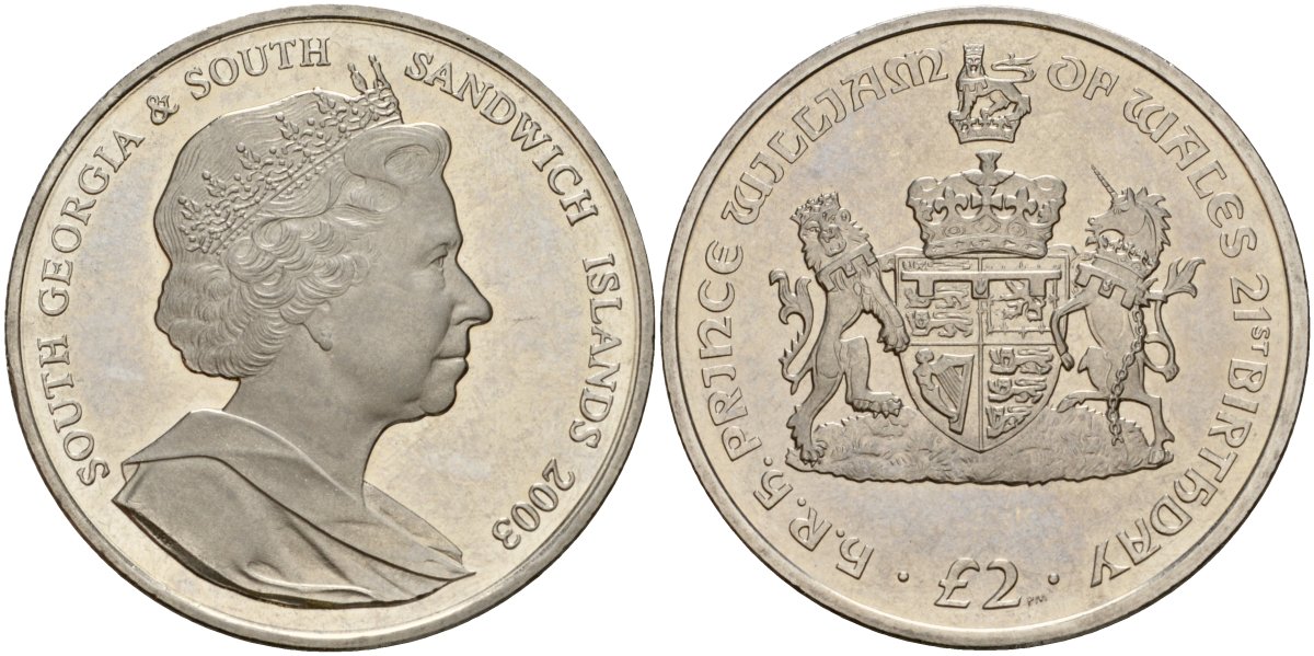 Южная Георгия и Южные Сандвичевы Острова 2 фунта 2003 PM, 21 год со дня рождения Принца Уильяма KM 17 медно-никель UNC 4125-814