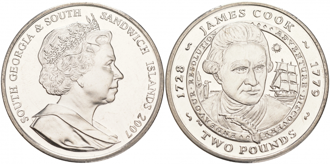 ЮЖНАЯ ГЕОРГИЯ И ЮЖНЫЕ САНДВИЧЕВЫ ОСТРОВА 2 ФУНТА 2007 1728-1779 ДЖЕЙМС КУК KM 36 медно-никель UNC M26-19