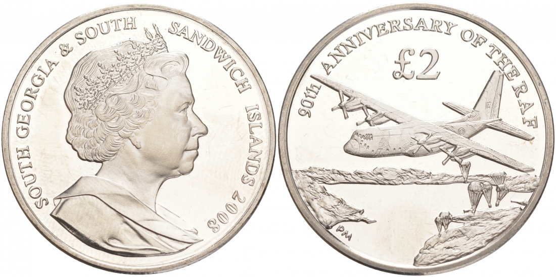 Южная Георгия и Южные Сандвичевы Острова 2 фунта 2008 90 лет ВВС Великобритании, самолет KM 49 медно-никель UNC M26-18