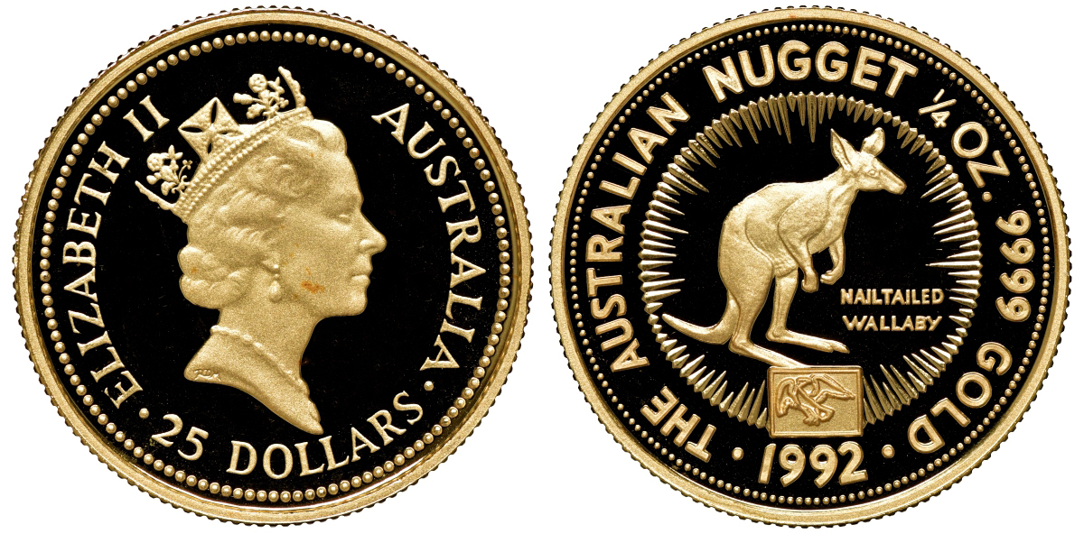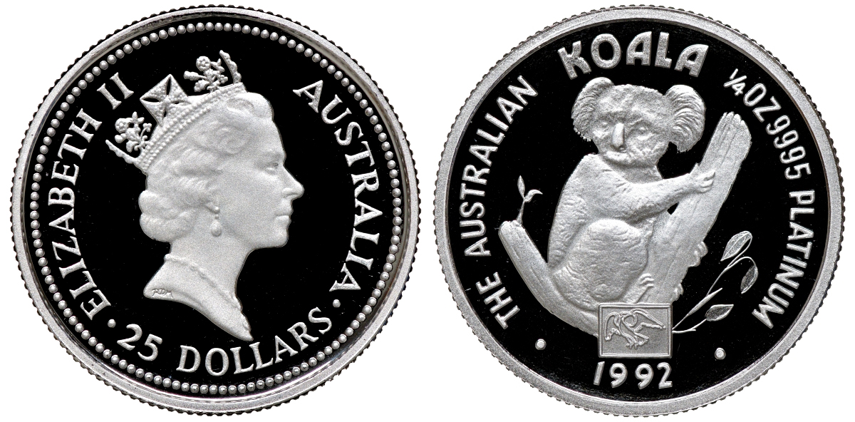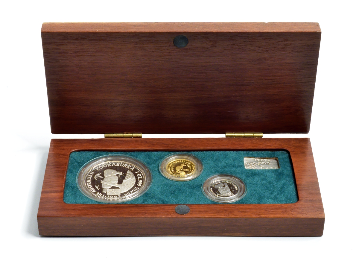 ---Австралия набор из 3 монет 1 доллар, 25 долларов, 25 долларов 1992 животные Австралии, тираж 750 экз № 0431 серебро, золото, платина 4-3-5-28