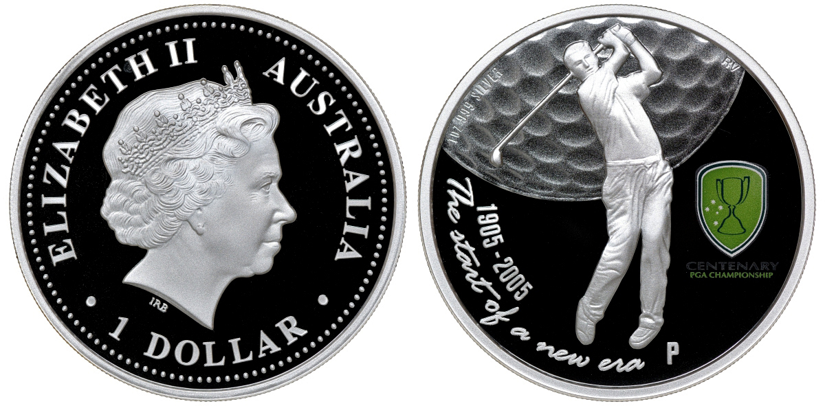 ----Австралия 1 доллар 2005 100 лет чемпионату мира по гольфу среди профессионалов (Professional Golfer's Association Championship), тираж 7500 экземпляров, в оригинальной коробке KM 831 серебро PROOF 8-1-05-09