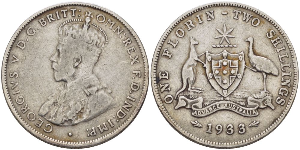 АВСТРАЛИЯ 1 ФЛОРИН 1933 ГЕОРГ V, ГЕРБ АВСТРАЛИИ KM 27 серебро 82-835