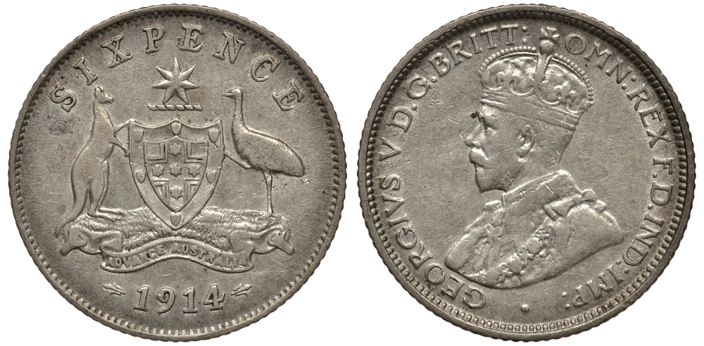 АВСТРАЛИЯ 6 ПЕНСОВ 1914 L, ГЕОРГ V (1910-1936), ГЕРБ АВСТРАЛИИ KM 25 серебро 272-124