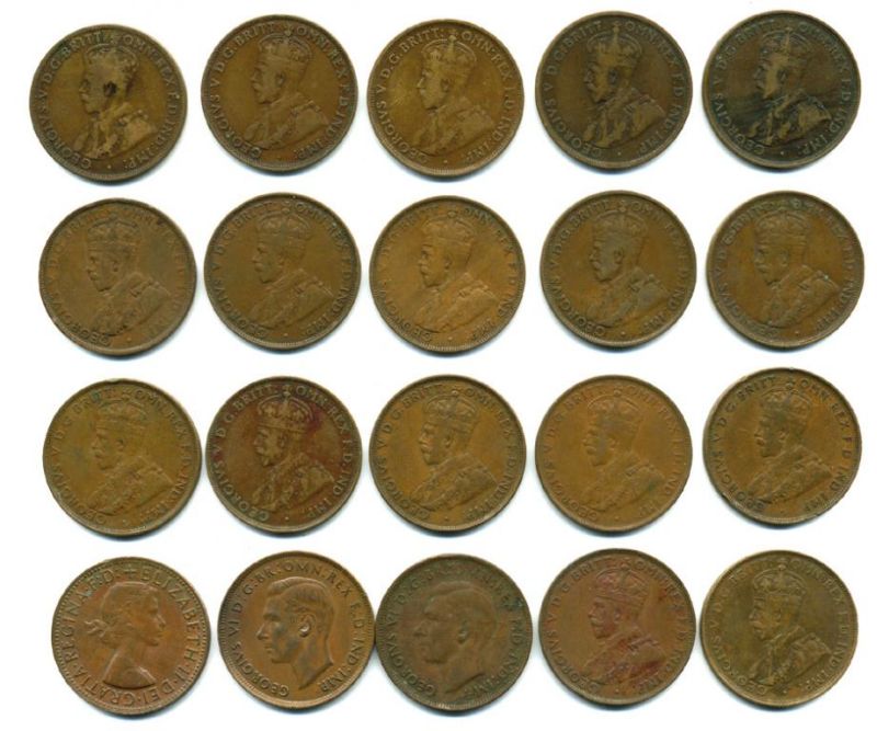 Австралия лот из 20 монет по 1 пенни 1911-1959 KM 23, 36, 43, 50 бронза M13-12