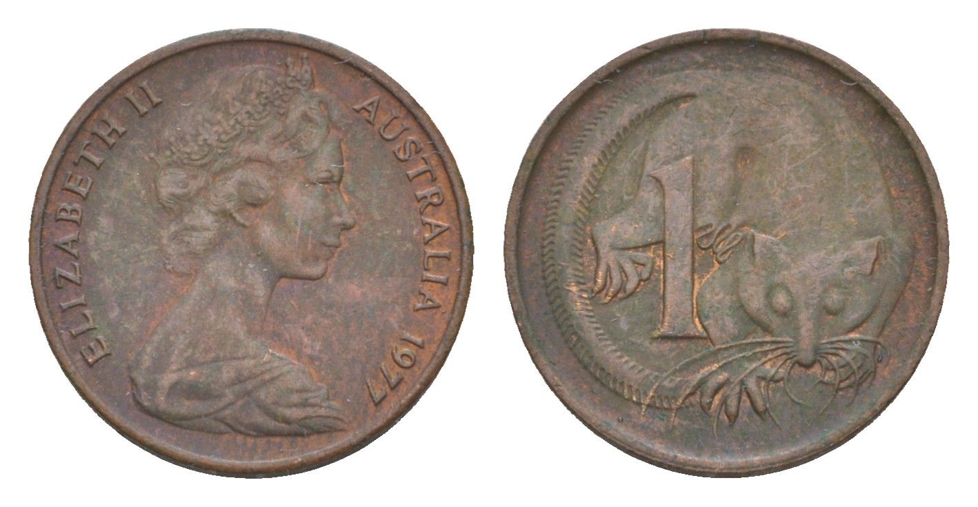 Австралия 1 цент 1977 Елизавета II (1952-2022), молодой портрет, опоссум KM 62 бронза 4655-1215