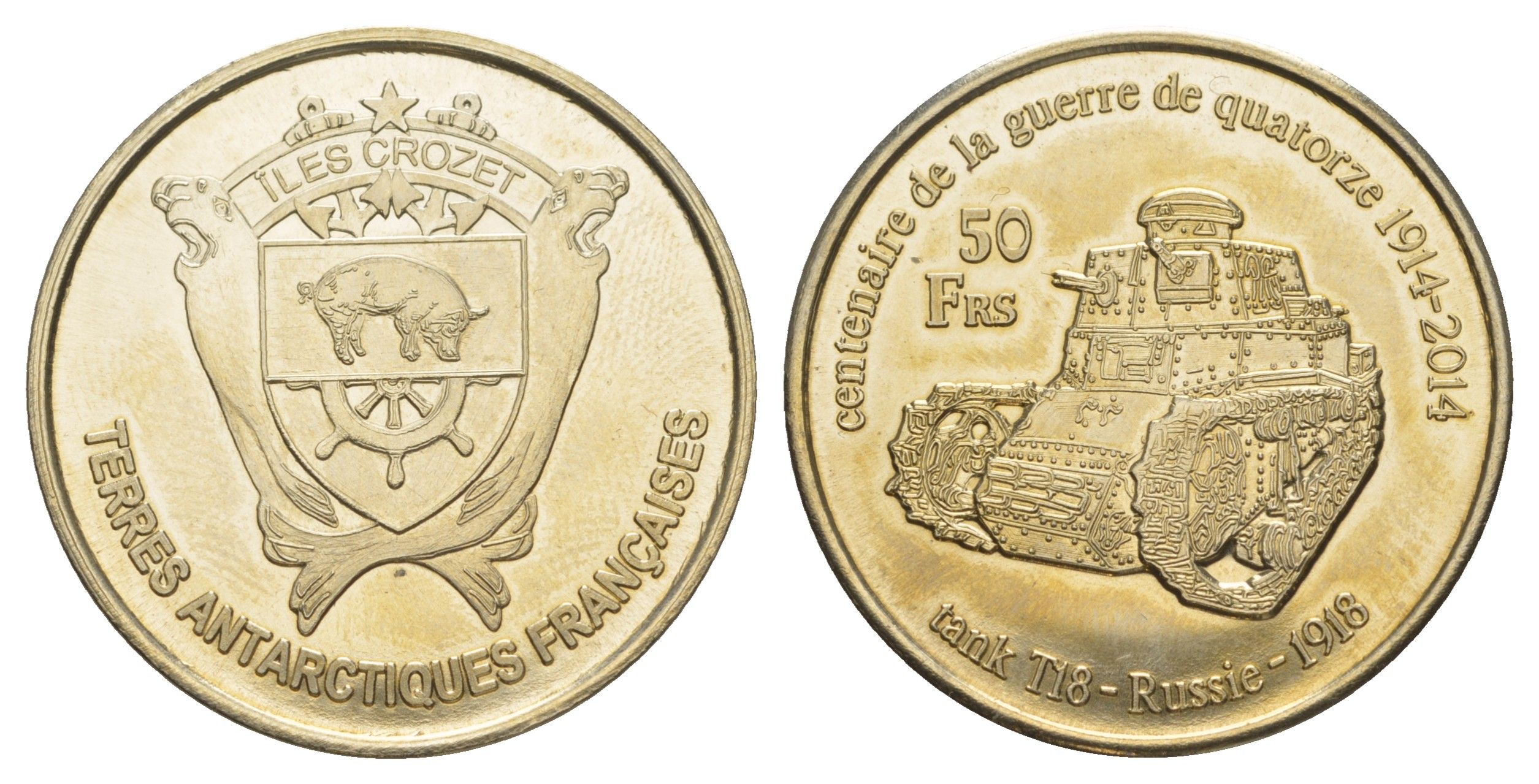 Французские Южные и Антарктические Территории (Острова Крозе) 50 франков 2014 танки Первой Мировой войны Т-18 - Россия (РСФСР, СССР) 1918 медно-никель BU 1521-1644