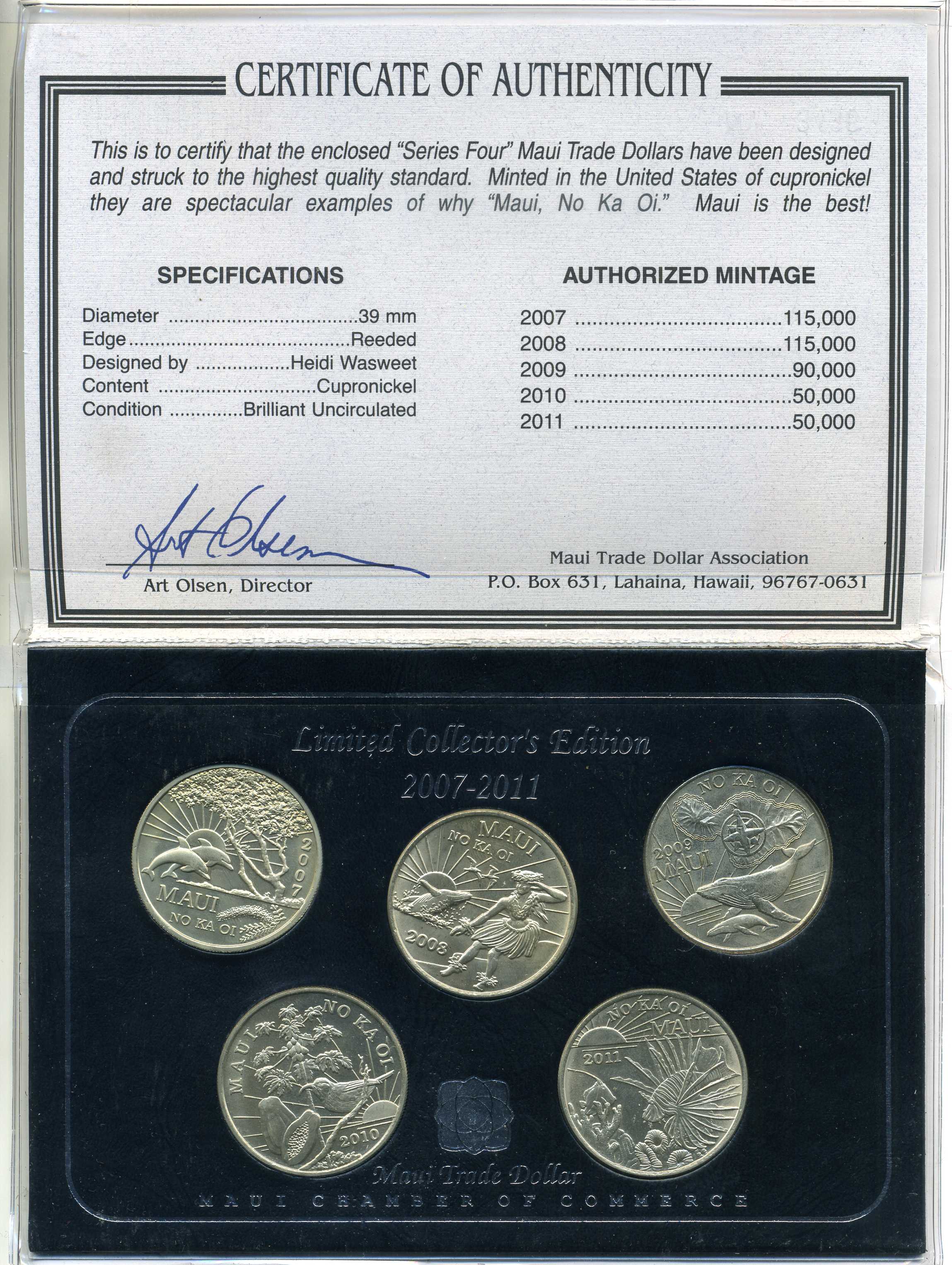 Гавайи, Мауи набор из 5 монет по 1 доллару 2007-2011 MAUI CHAMBER OF COMMERCE, в оригинальном картонном буклете, сертификат медно-никель UNC 5-4-4-1
