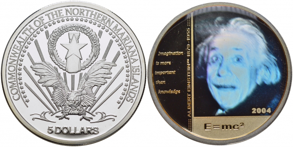 Северные Марианские острова 5 долларов 2004 Альберт Эйнштейн, формула, голограмма KM X5 серебро PROOF 1069-10-44 M17-9
