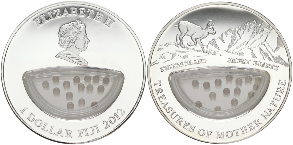 ----Фиджи 1 доллар 2012 серия Сокровища матери-природы, дымчатый кварц, в коробке, с сертификатом KM 453 серебро PROOF 1-4-3-04