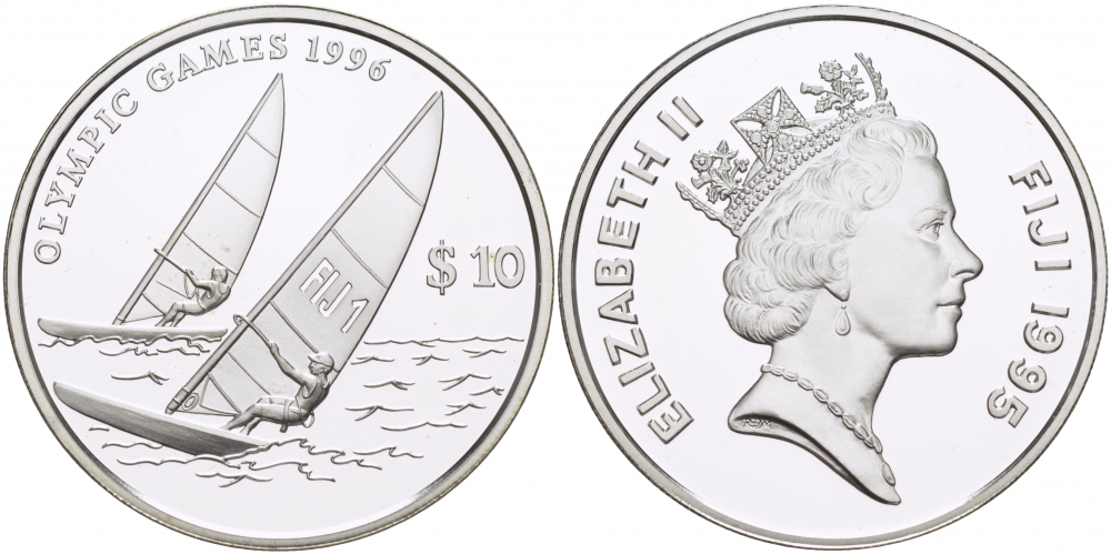 Фиджи 10 долларов 1995 XXVI Олимпийские игры 1996 года в Атланте, парусный спорт KM 79 серебро PROOF 04-313-35