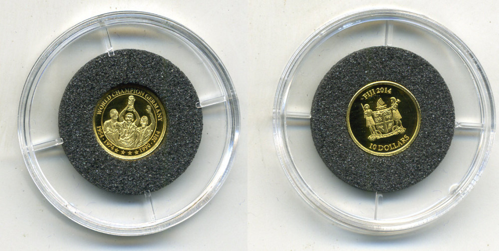 Фиджи 10 долларов 2014 сборная Германии по футболу, чемпион мира 2014 года, 1954, 1974, 1990 KM NEW золото PROOF 00-00