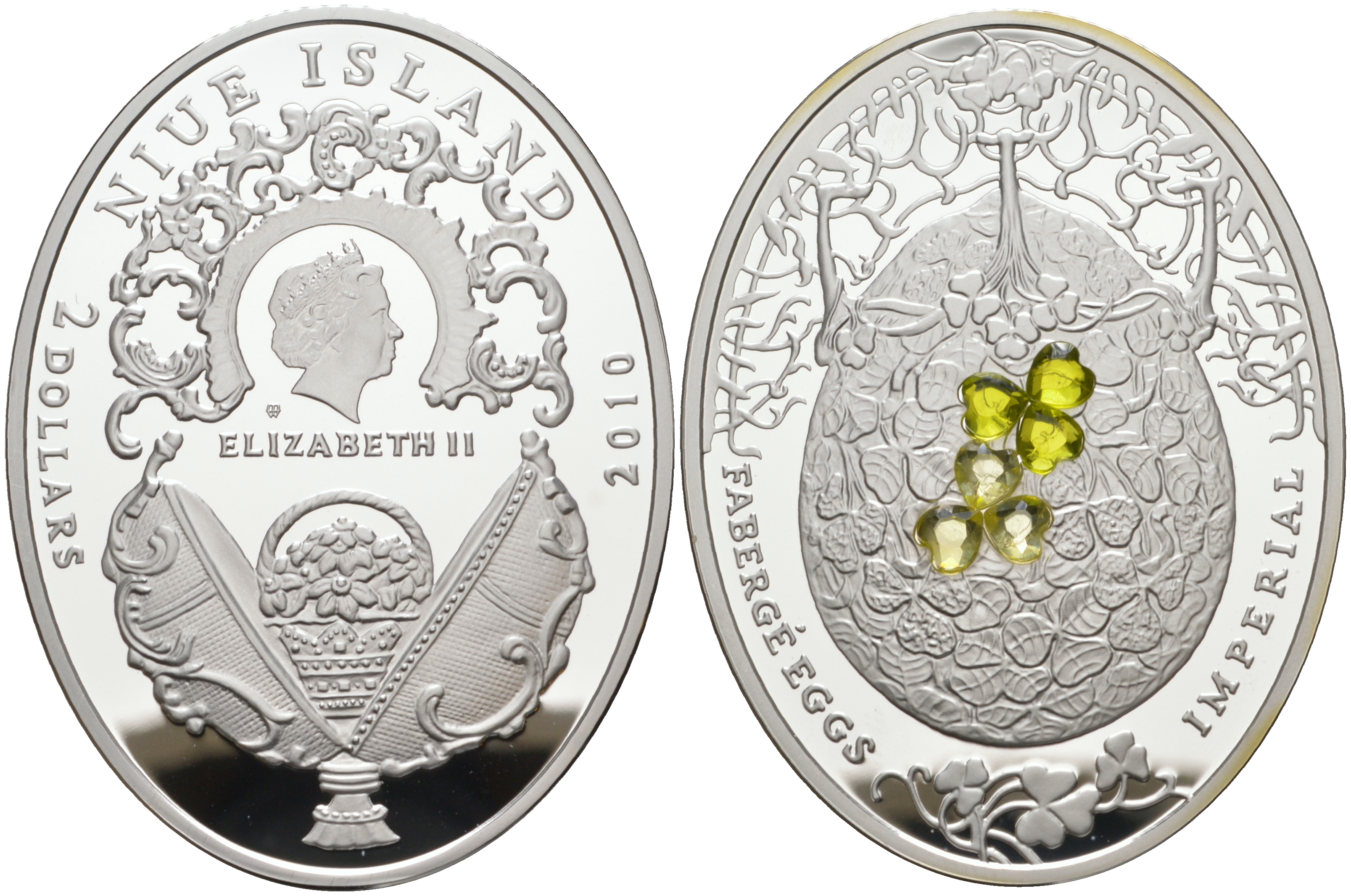 Ниуэ 2 доллара 2010 яйца Фаберже, лист клевера, тираж 7000 экз., размер 41,6 Х 55,6 мм., вес 56,56 гр.., сертификат KM 424 серебро PROOF 1072-4-21