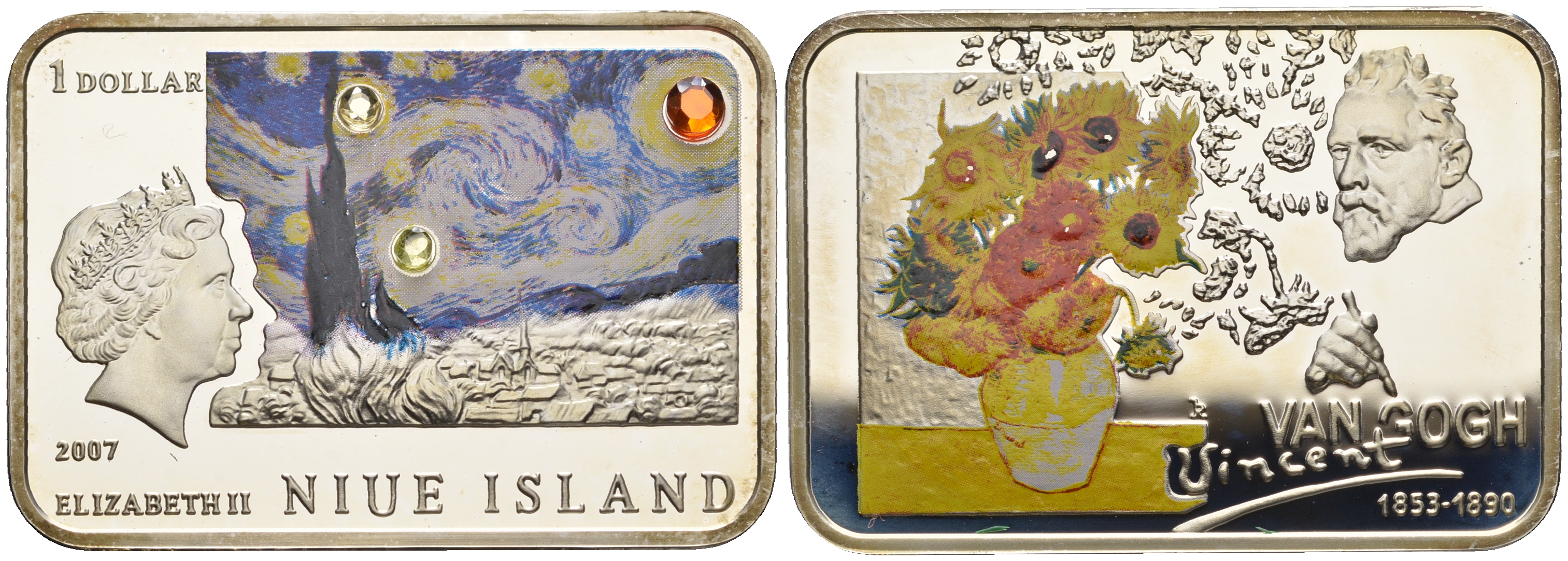 Ниуэ 1 доллар 2007 Известные художники - Винсент Ван Гог, подсолнухи, Елизавета II (1952-2022) KM 176 серебро PROOF 1097-3-22