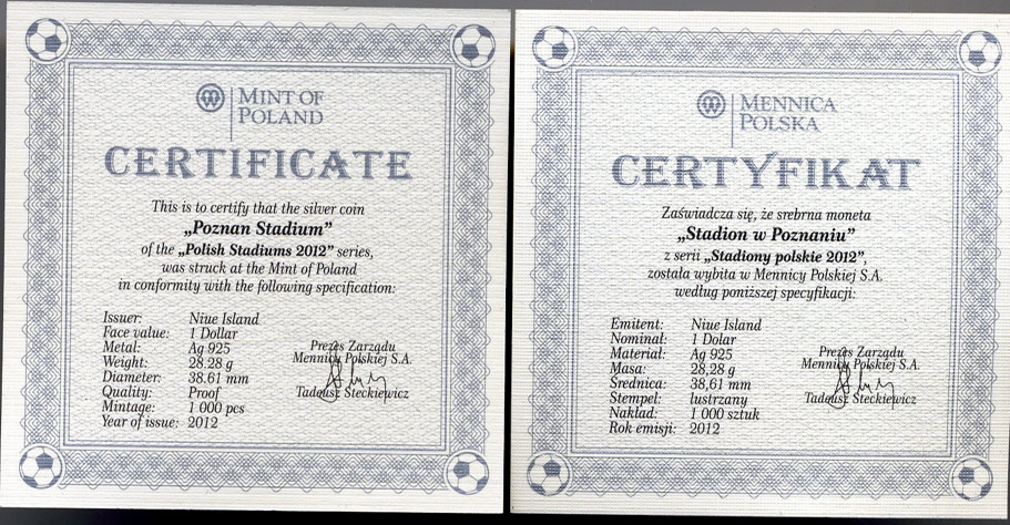 Ниуэ 1 доллар 2012 футбол чемпионат, стадион в Познани, в оригинальной коробке с сертификатом тираж 1000 шт. KM NEW серебро PROOF 2-4-2-18