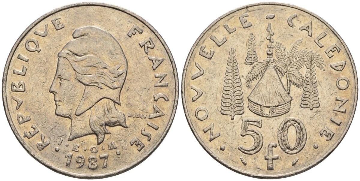 Французская Новая Каледония 50 франков 1987 хижина среди сосен и пальм, (IEOM) KM 13, Schoen 15, Lec 121 никель 4120-242