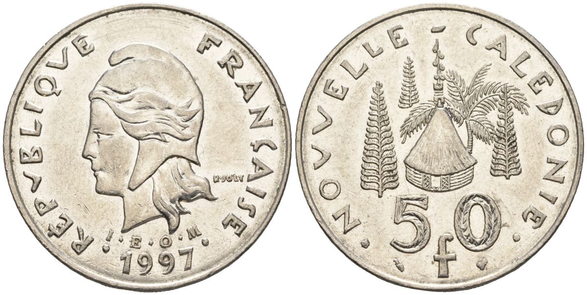 Французская Новая Каледония 50 франков 1997 хижина среди сосен и пальм, (IEOM) KM 13, Schoen 15, Lec 121 никель 4123-743