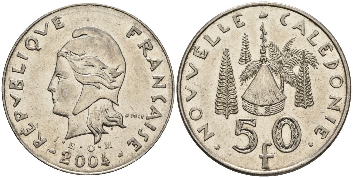 Французская Новая Каледония 50 франков 2004 хижина среди сосен и пальм, (IEOM) KM 13, Schoen 15, Lec 121 никель 4144-542